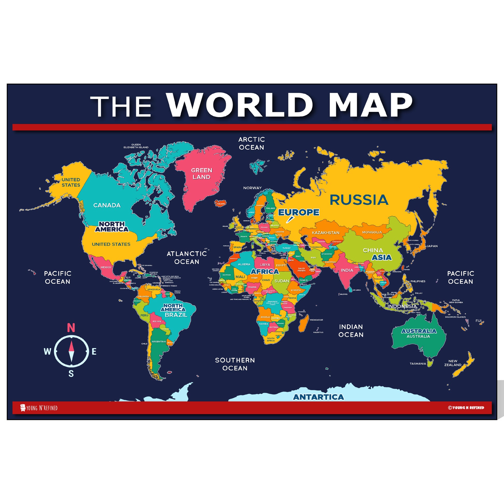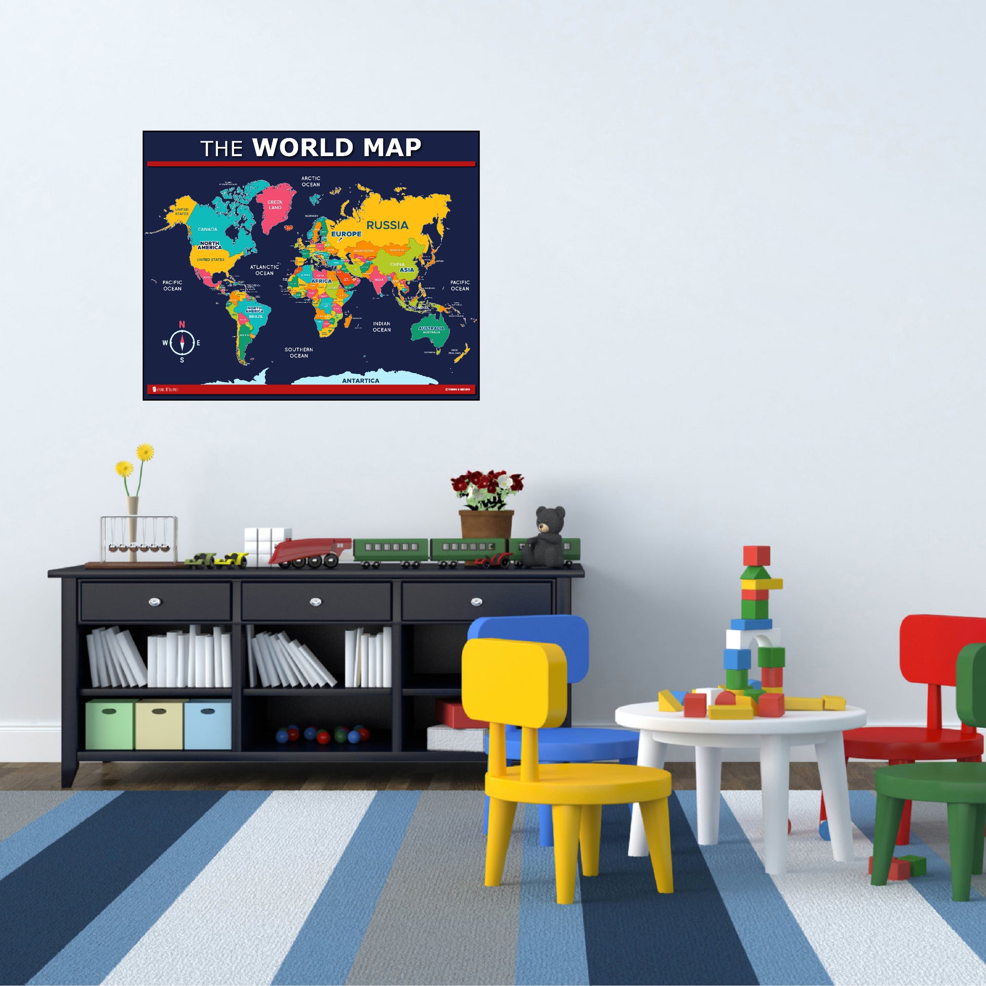 The colorful map displays of the World. It is specifically illustrated and designed for kids to learn world geography. Students can quickly learn & locate different states & capitals with this map. Each Country on the poster is precisely distinguished by the color variations. Thick lamination cover of this map makes it durable & protects from the markers, dust, water, and tears. It’s a geographically modern and up-to-date map that can be placed on classroom and bedroom walls.