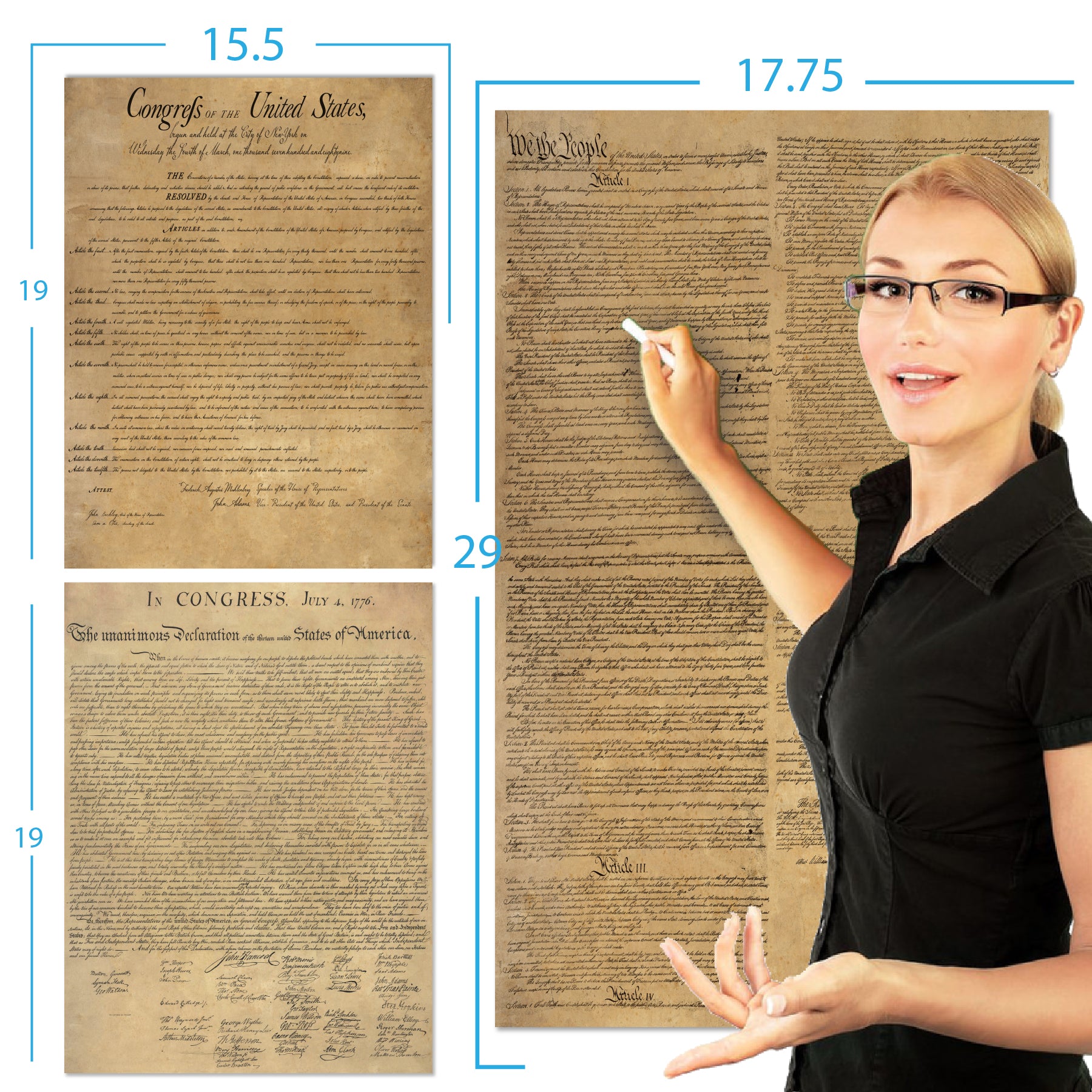 - Charts include US. constitution (15x19), The Bill of Rights (15x19) and Declaration of Independence (18x30).