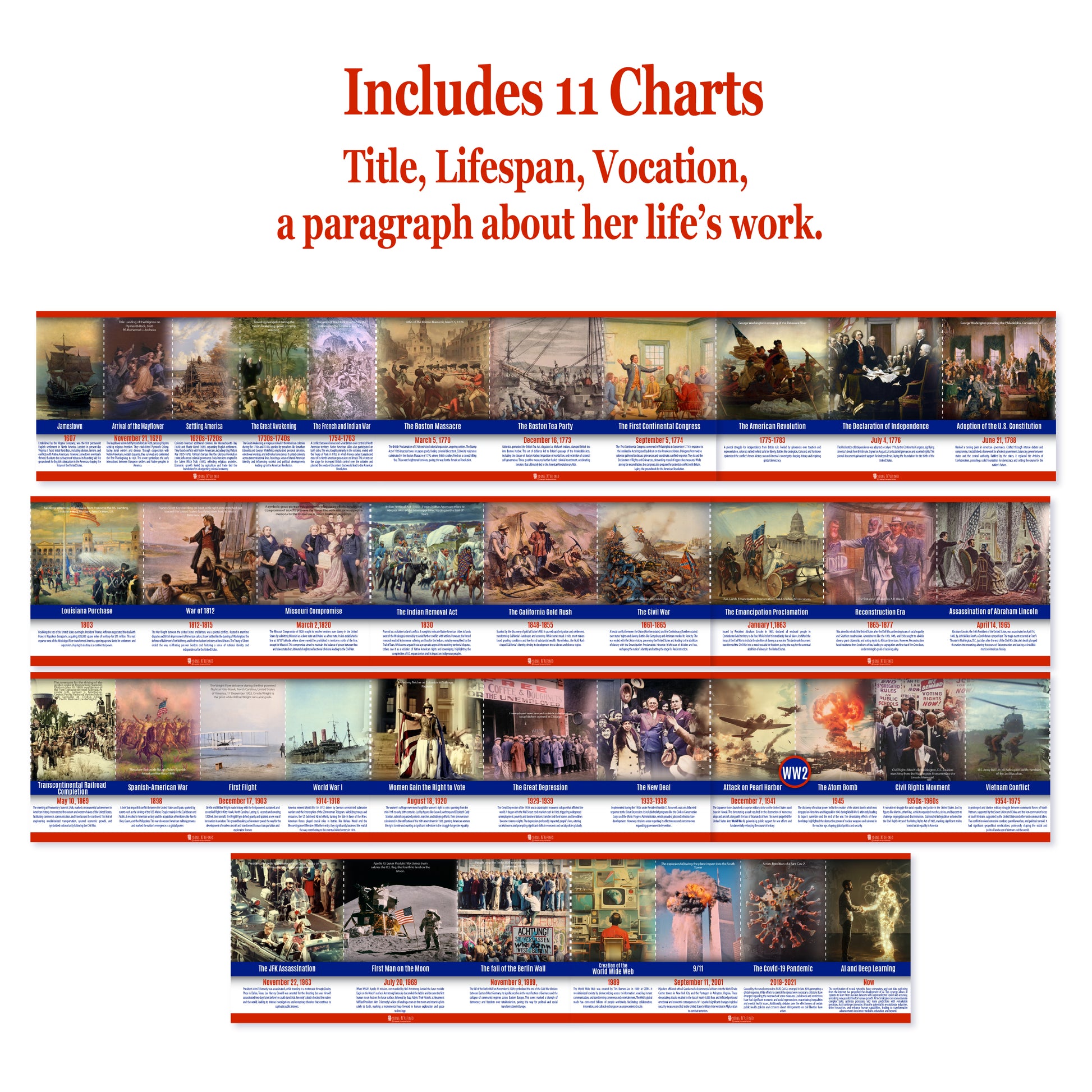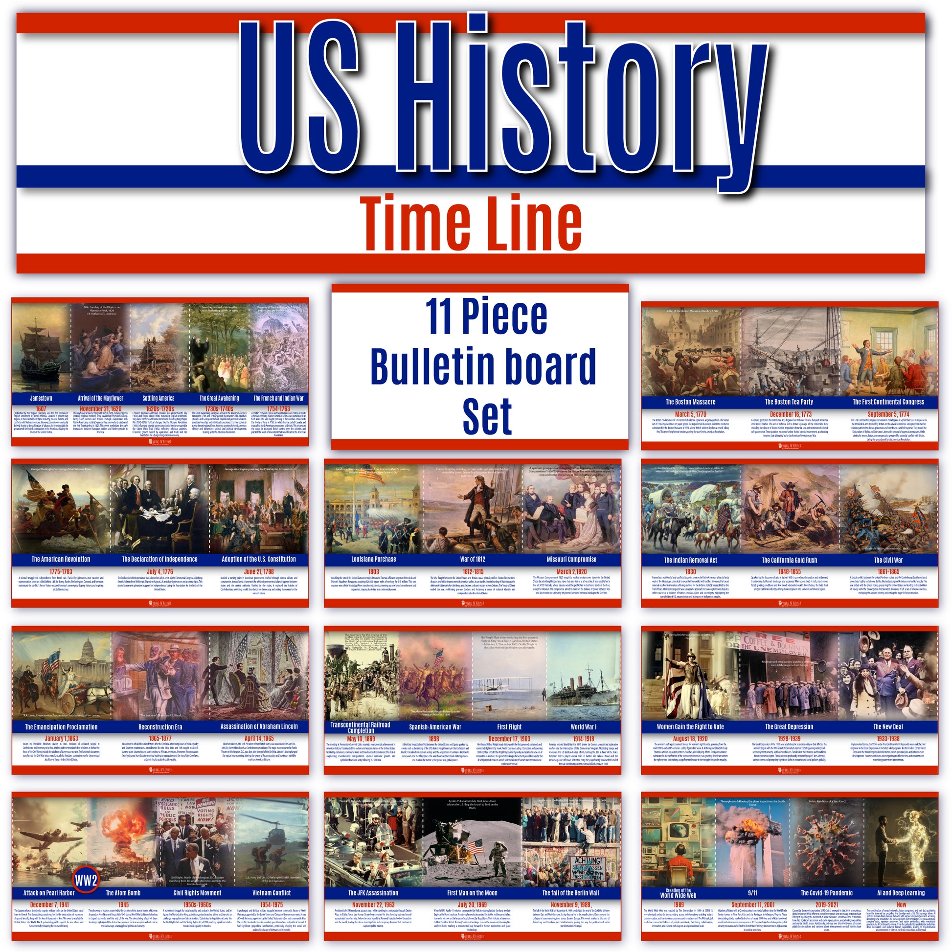 Introducing our American History Timeline, a captivating educational tool spanning from the creation of Jamestown to the first moon landing and beyond. Printed on premium glossy paper with vibrant colors, this timeline comprises 11 parts, each measuring 9x18 inches, combining to form an impressive 16.5 feet in length. Perfect for classrooms, event halls, or hallways, these durable charts serve as bulletin board sets, posters, or banners, catering to various school settings. Ideal for students of all ages, from grade school to university, this visually engaging timeline brings American history to life, inspiring curiosity and learning.