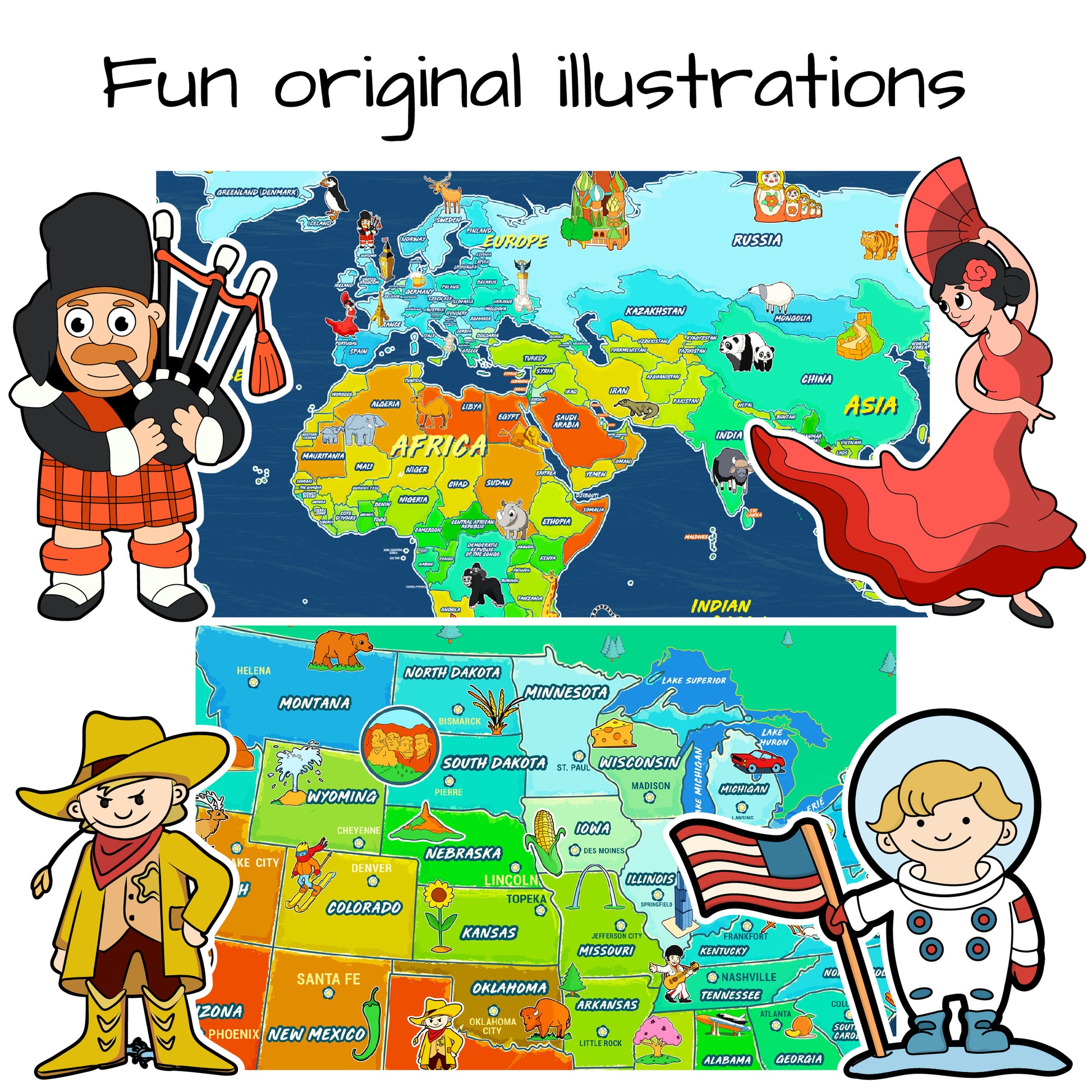 - US map includes state capitals, World map includes all countries, 7 continents and 5 oceans.