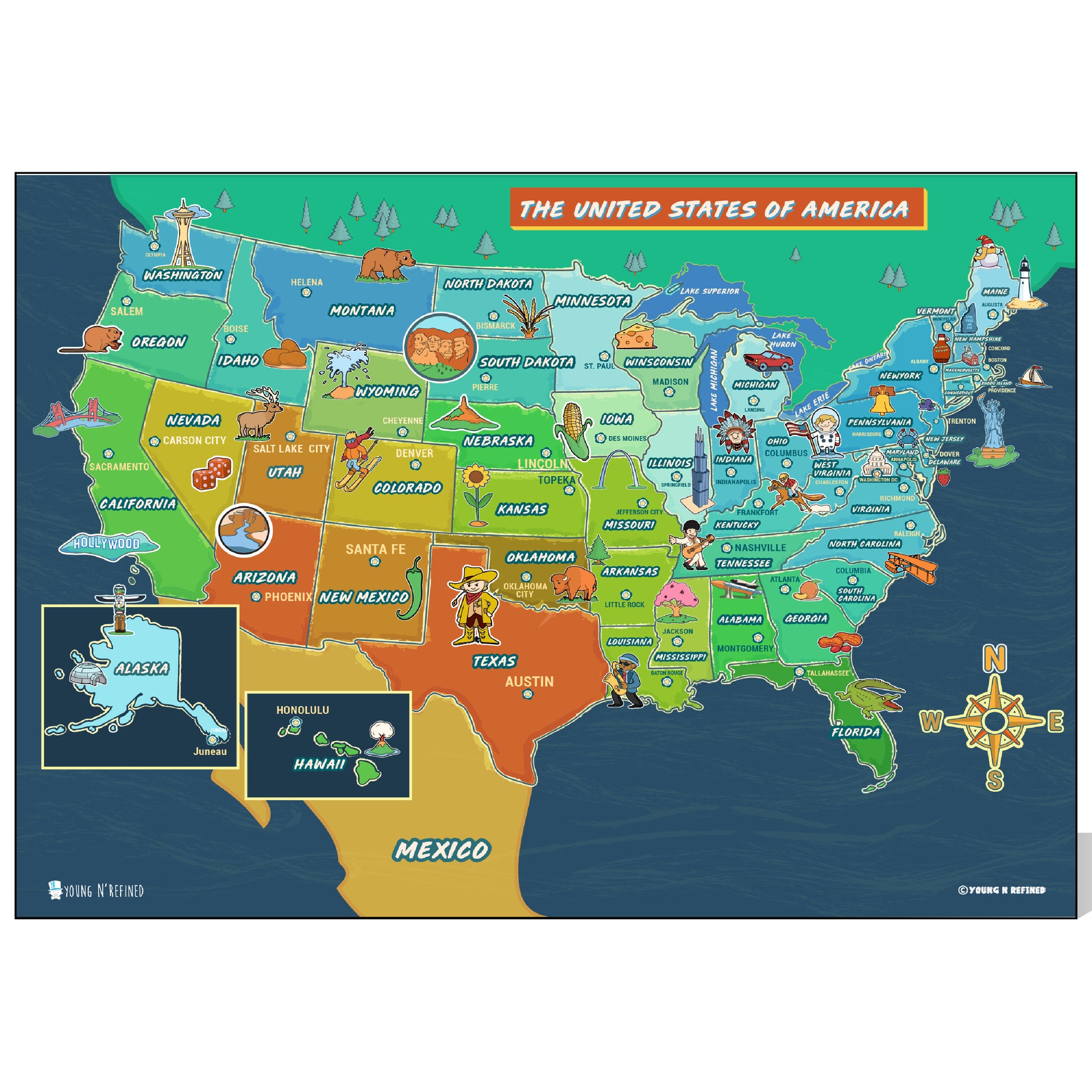 USA and World map poster 2 pack for kids Laminated large illustrated Young N Refined